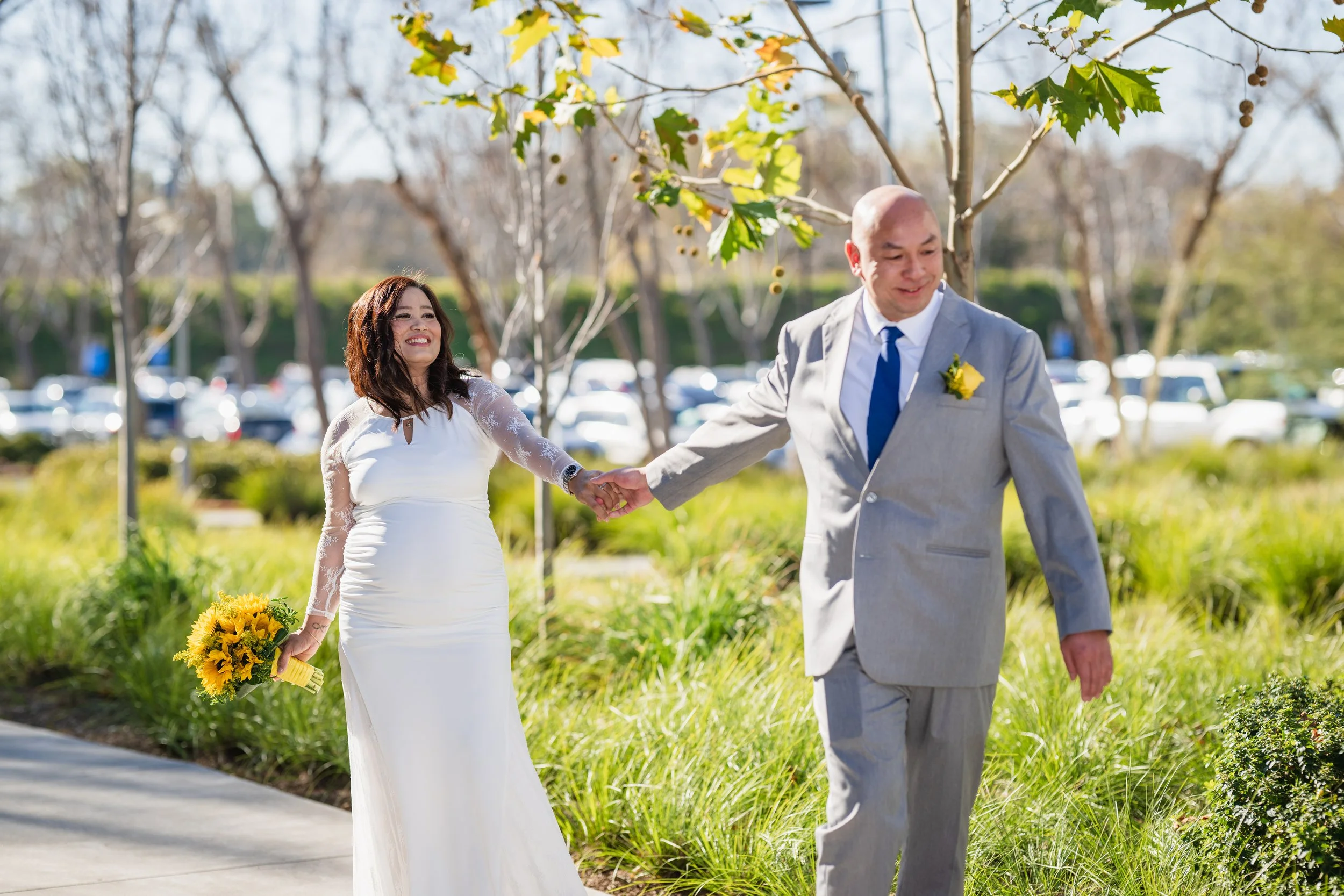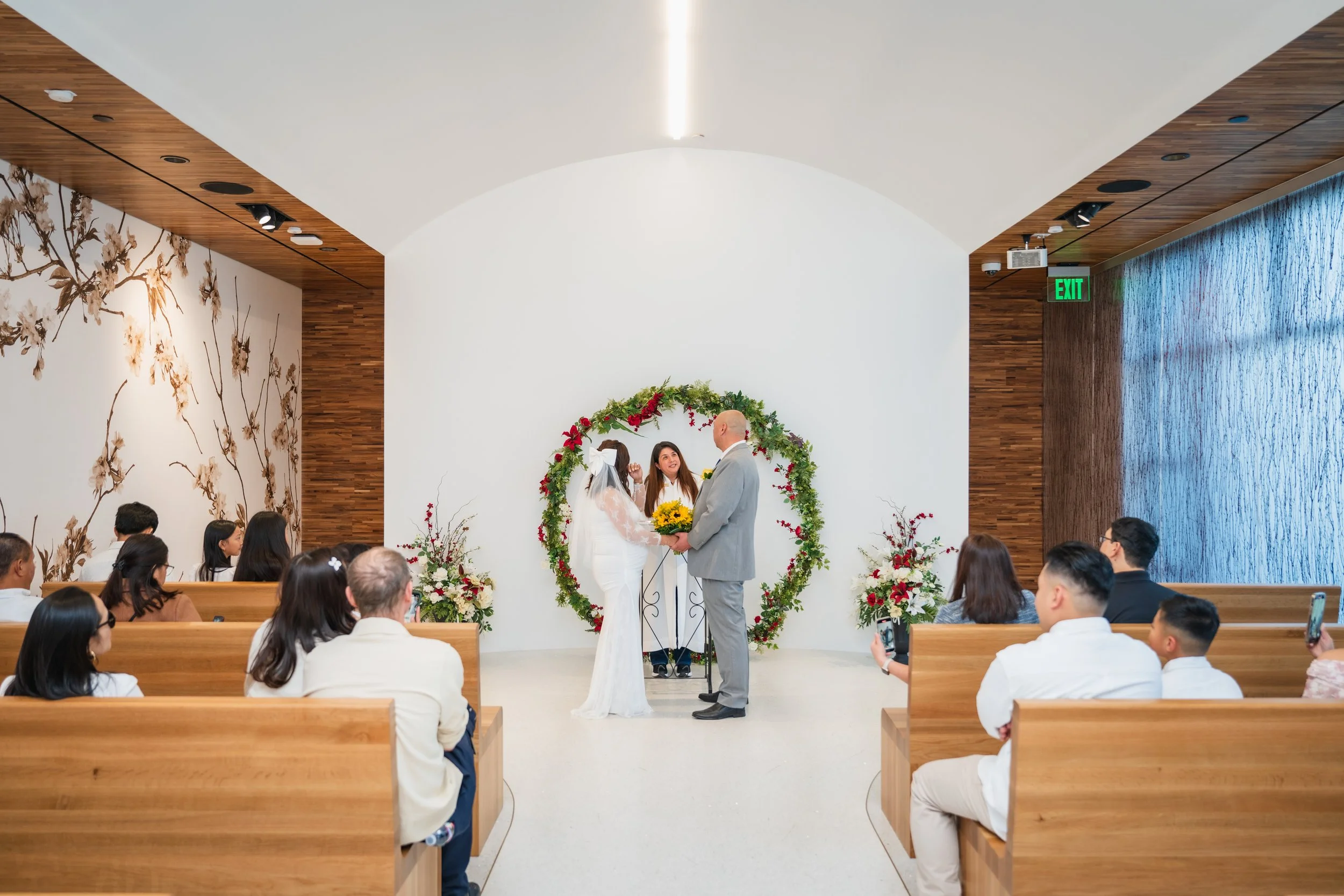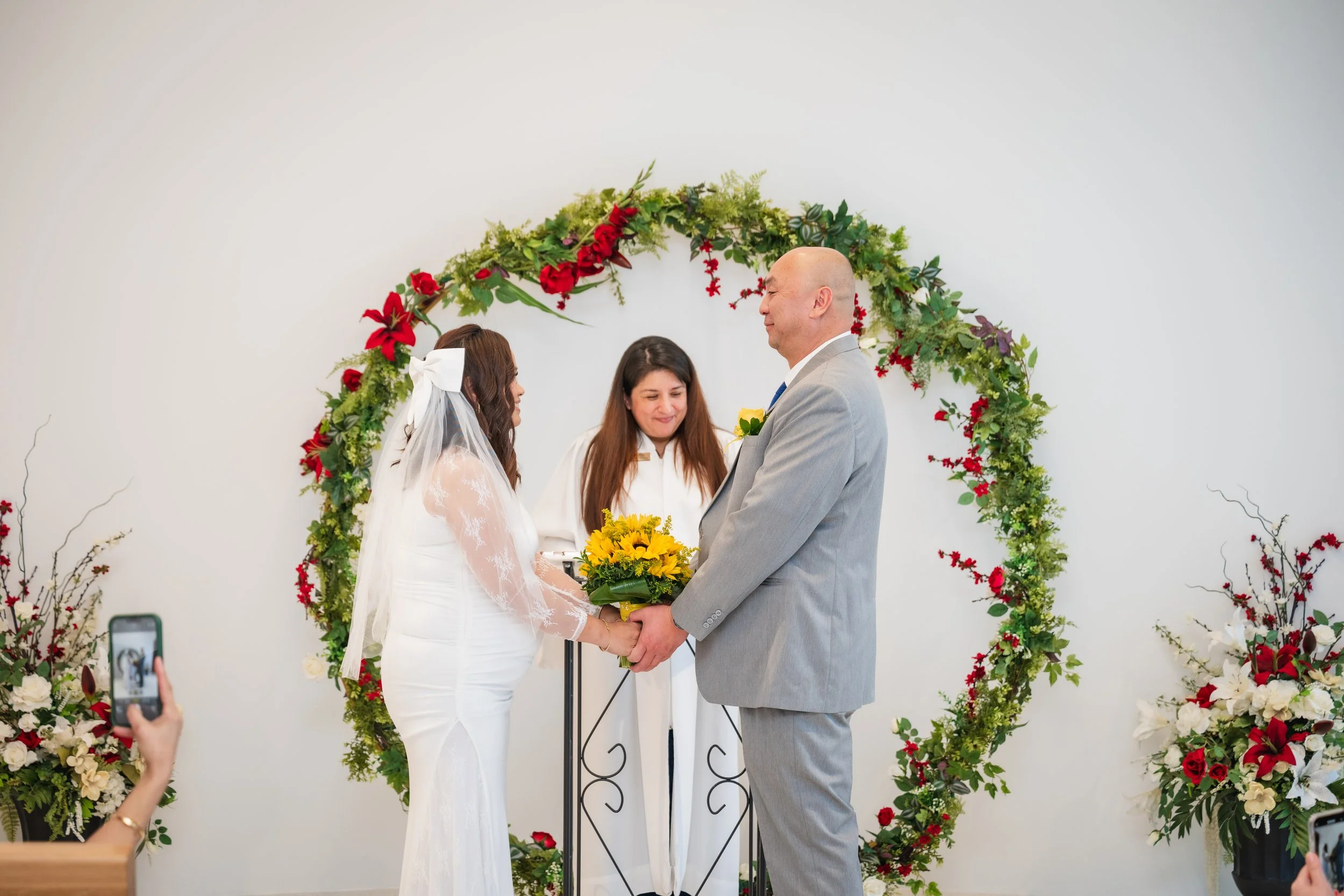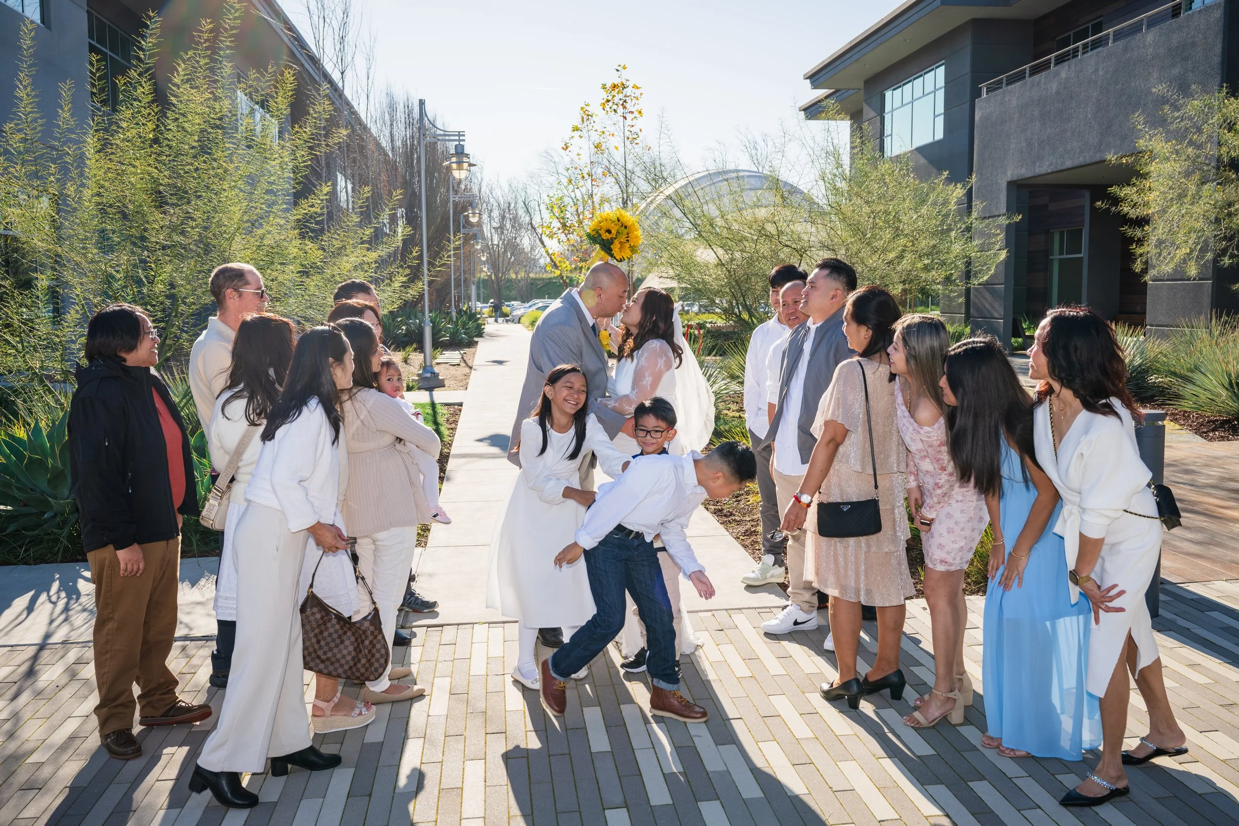 A family-centered civil wedding at the Santa Clara County Clerk-Recorder’s Office with around 20 guests, including ceremony coverage, group portraits, and relaxed outdoor portraits for the couple.